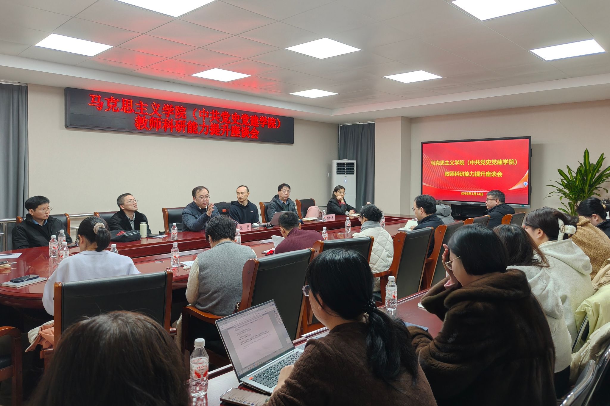 2026年1月14日上午10:00,马克思主义学院(中共党史党建学院)在东校区第四教学楼415会议室召开教师科研能力提升座谈会。会议邀请燕山大学文法学院于春洋教授做主题报告,并以午餐会形式进行交流。柴勇院长主持座谈会,学院党委书记甄红军及35名教师参会。