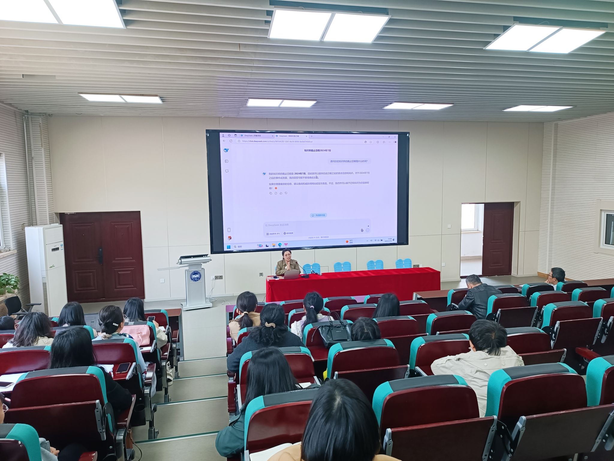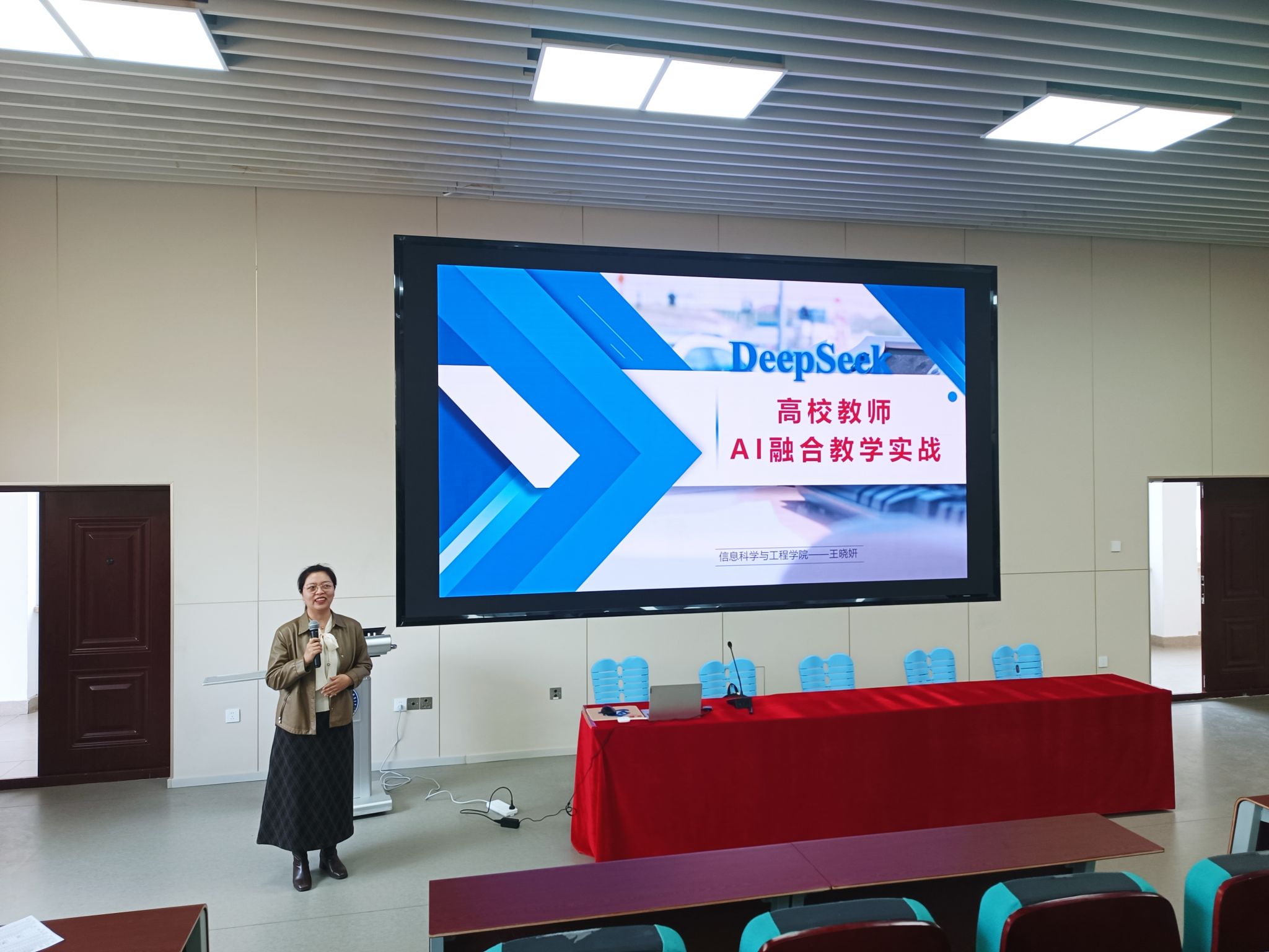 培训会上,王晓妍老师以“DeepSeek-高校教师AI融合教学实战”为主题,聚焦AI前沿探索教育新生态,解锁教学科研新场景,深入剖析了AI技术对教育教学的革新作用。她指出:“AI不是我们的敌人,而是我们的伙伴,是我们的数字分身”。