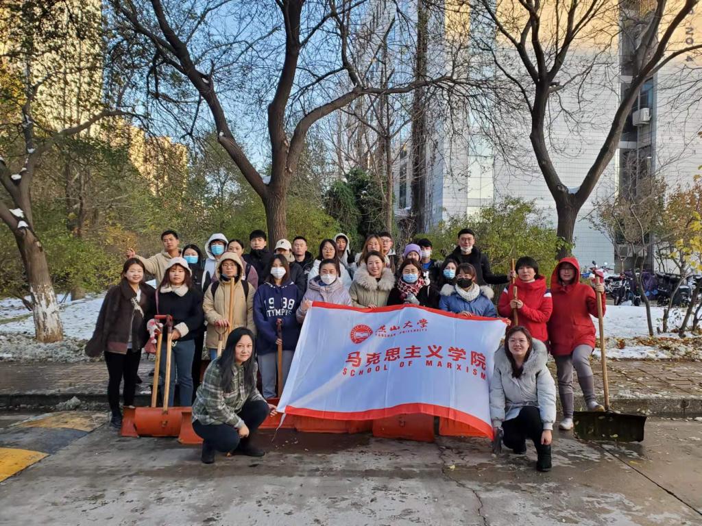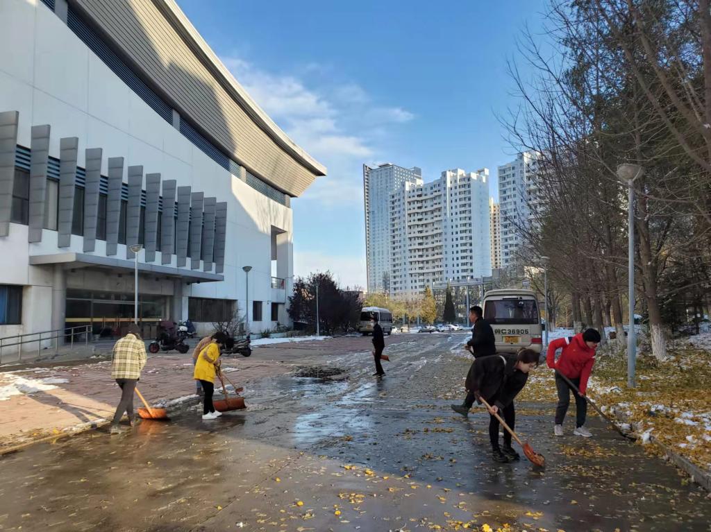 上周末,秦皇岛迎来了入冬后的第一场降雪,降雪和低温导致路面湿滑,给师生出行带来诸多不便。为保障校园内道路顺畅,车辆、行人安全出行,马克思主义学院党委于11月8日下午组织党员师生开展责任区清雪除冰活动。
