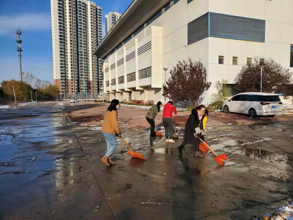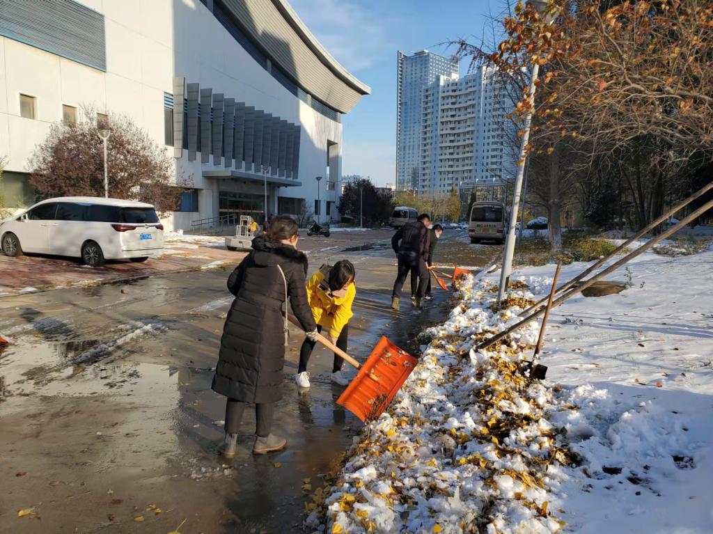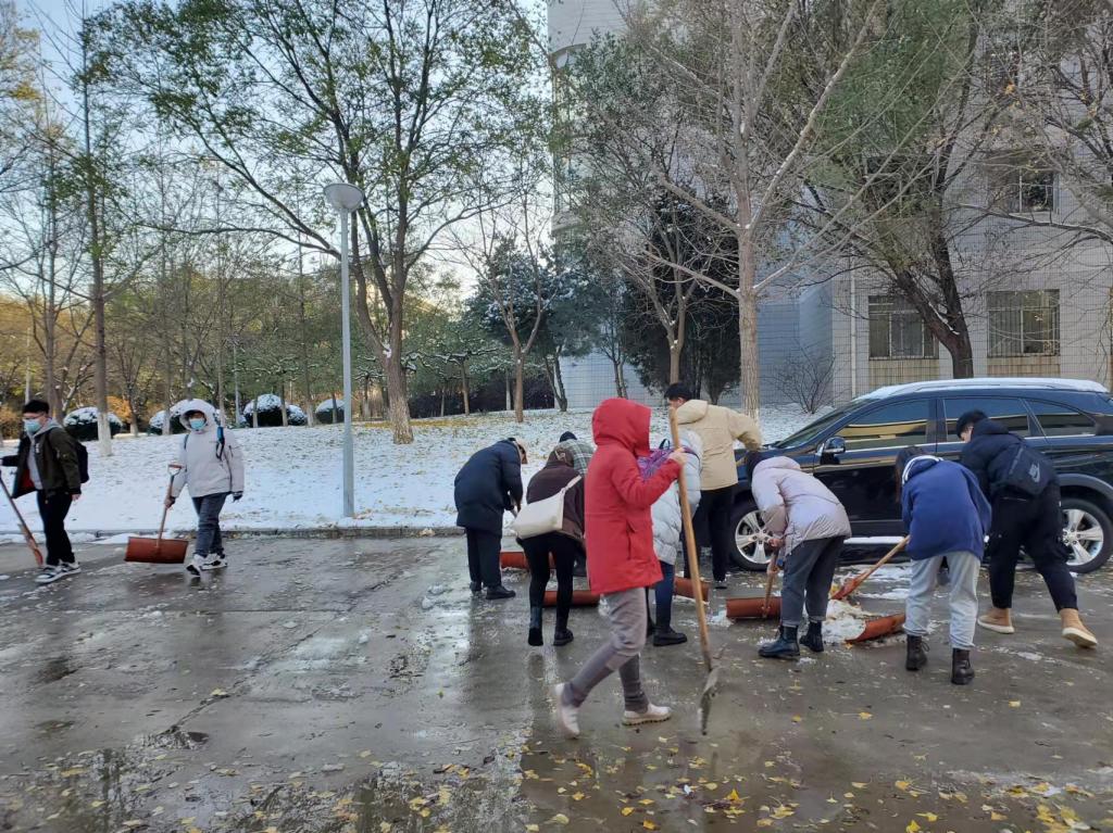 学院组织领取分发铁锹、雪铲等工具,号召没课的党员师生参加责任区清雪活动。40余名党员不畏严寒、挥舞铁铲,在责任区内清理路面上的积雪、融冰。