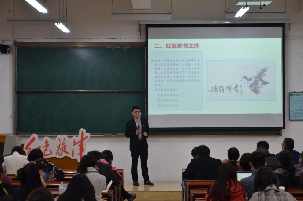 根据学院党委春季学期政治理论学习计划安排,4月22日晚7:00,由马克思主义学院主办,马克思主义学院研究生会承办的第一百五十五期“红色旋律”讲坛在西校区里仁学院J206室举行,本期讲坛的题目是《红色家书与中国共产党的精神世界》,由马克思主义学院杨新宾老师主讲。