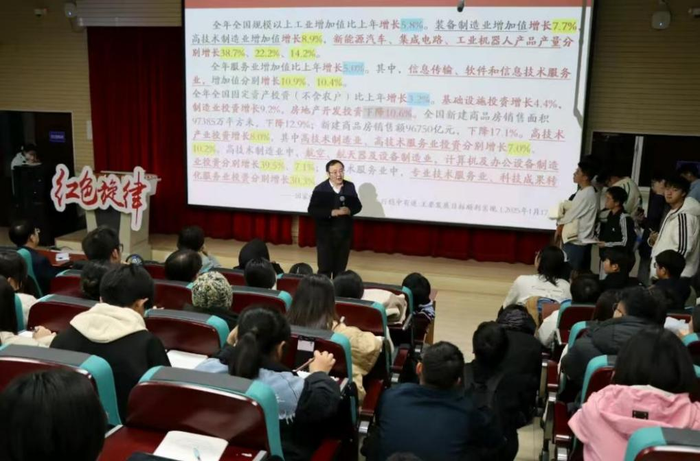 在展望未来时,讲座紧紧围绕准确把握“十五五”时期的历史方位和国内外形势、指导方针和主要目标,聚焦高质量发展主题,深入解读了建设现代化产业体系、加快高水平科技自立自强、扩大高水平对外开放、优化区域经济布局等战略任务。柴勇老师强调,坚持和加强党的全面领导是推进中国式现代化的根本保证,完成好“十五五”规划需要充分调动全社会投身中国式现代化建设的积极性主动性创造性,形成人尽其才、才尽其用、万众一心、勠力进取的生动局面。最后,柴勇老师勉励师生秉持“一米宽、百米深”的钻研精神、坚持“做困难而正确的事”的长期主义、践行“从实验室到生产线”的务实作风,把握时代机遇,将所学所长融入国家发展,努力成长为推动高质量发展的栋梁之材。本次讲座在全场热烈掌声中圆满结束。