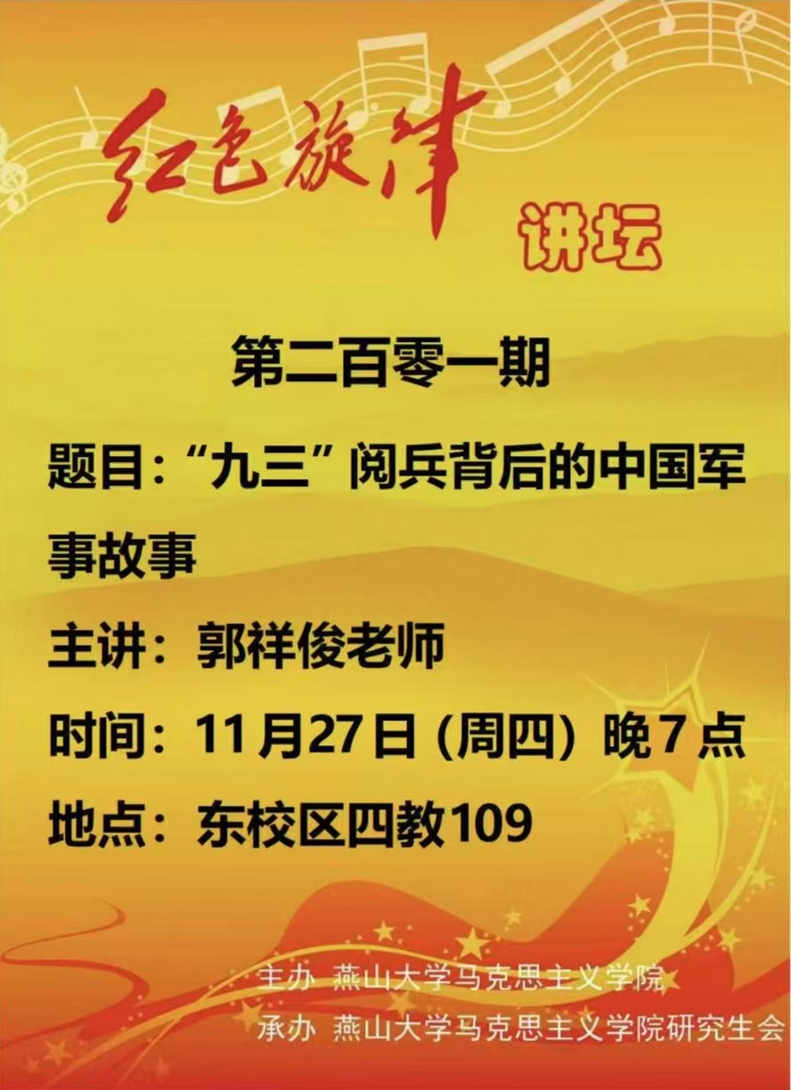话说天下大事,畅谈中外古今;领略名师风采,沐浴知识阳光;体验思想激荡,感悟红色豪情。由马克思主义学院主办、马克思主义研究生会承办的“红色旋律”讲坛,秉承厚德、博学、求是的理念,播撒红色火种,薪火相传;实现传道、授业、解惑,筑造燕园学子的精神家园。